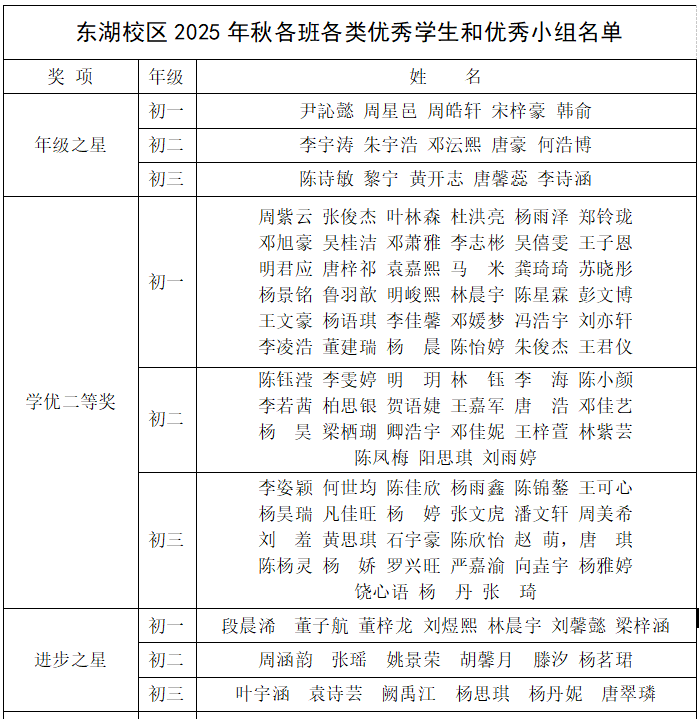 少年自有凌云志,不负韶华行且知。在追梦路上,一批学子勤学善思、奋勇争先,用奋斗定义青春,用坚持书写进步。东湖校区党支部书记、年级主任徐林宣读了优秀学生、进步之星、优秀科代表、优秀班团干部、文明之星、优秀学习小组表彰名单。一张张证书映照着少年风采,一次次掌声传递着榜样力量,激励全体学子见贤思齐、笃行不怠。