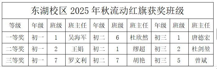 班风正则学风浓,班级强则校区兴。一面面流动红旗,凝聚着团结奋进的汗水,彰显着文明向上的风貌。白塔中学党委委员、纪委书记、东湖校区分管联系负责人佘洪宣读流动红旗获奖班级名单。红旗所指,心之所向;荣誉加身,使命在肩,每一份荣光背后,都是全体师生同心同向、聚力前行的最美模样。