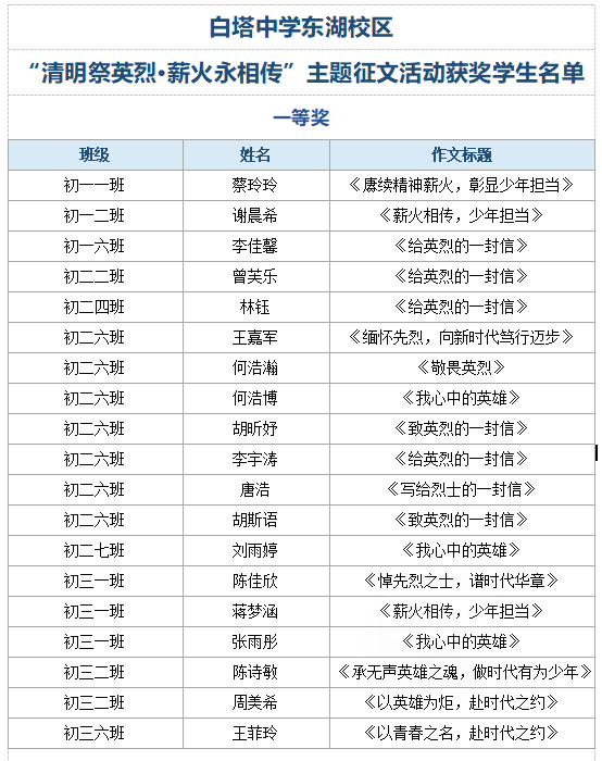 为深化教育效果,学校同步开展“清明祭英烈,薪火永相传”主题征文活动。同学们踊跃参与,以《我心中的英雄》《给英烈的一封信》《薪火相传,少年担当》等为题,用真挚笔触书写对英烈的崇敬、对历史的敬畏、对时代的担当。有的深情回望革命先辈浴血奋战的峥嵘岁月,有的立足家乡红色故事抒发家国情怀,有的立下勤学笃行、报效祖国的青春誓言。一篇篇文辞恳切、情感饱满的作品,展现了白塔学子深厚的爱国情怀与昂扬的精神风貌。经过严格评选,一批优秀作品脱颖而出,充分彰显活动育人成效。
