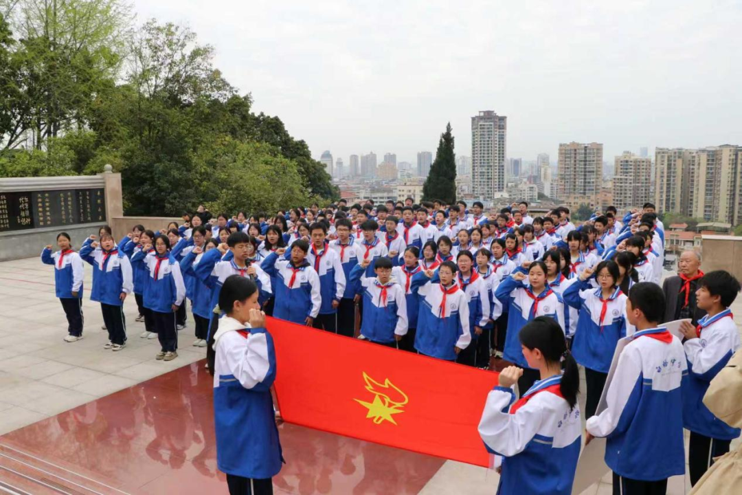 代书记讲话结束后,全体学生面向革命烈士纪念碑,高举右拳,在领誓人的带领下重温入队誓词,以青春之名庄严宣誓。他们神情庄重、目光坚定,铿锵有力的誓言在陵园上空久久回荡,拳拳赤子之心尽显新时代少年的责任与担当。