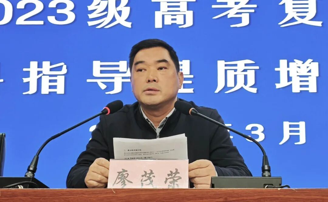 学校党委书记廖茂荣作总结讲话。廖书记首先从宏观层面剖析了当前高考评价体系变革带来的深刻影响,对学校的办学质量提出了更高、更精准的要求。廖书记强调,全体高三教师必须统一思想,提高认识,聚焦问题,狠抓落实:班主任层面,要落实临界生转化任务,将责任明确到人、到科;备课组层面,要将培训所得、政策所变融入日常教研,提升教研实效;行政层面,班子成员要下沉一线,深入班级和备课组,参与备考,做好服务;职能部门,要全方位做好后勤保障,为高考冲刺保驾护航。廖书记号召大家拿出“不待扬鞭自奋蹄”的自觉,坚定“决战必胜”的信念,真抓实干,攻坚克难,用辛勤的汗水和集体的智慧,在2026年高考中再创白中辉煌。