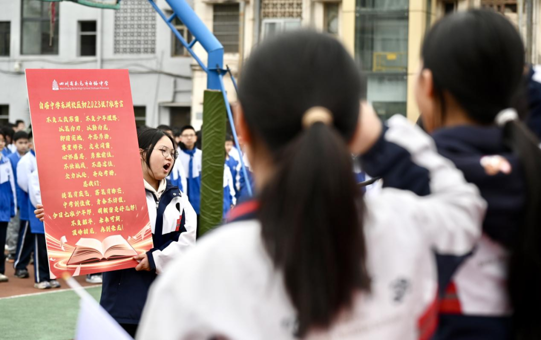 战旗高扬,号令铿锵。白塔中学党委委员、纪委书记佘洪发布青春逐梦号令:“凝心聚力逐梦青春,全力以赴勇夺佳绩”,并为1、2、3班逐一授旗;党委委员、副校长任致远发布青春逐梦动员令:“不负韶华,只争朝夕;逐梦青春,马到成功”,并为4、5、6、7班逐一授旗。