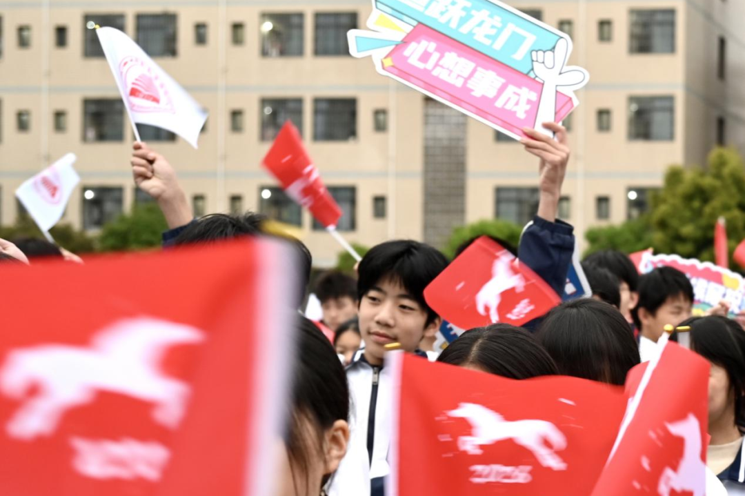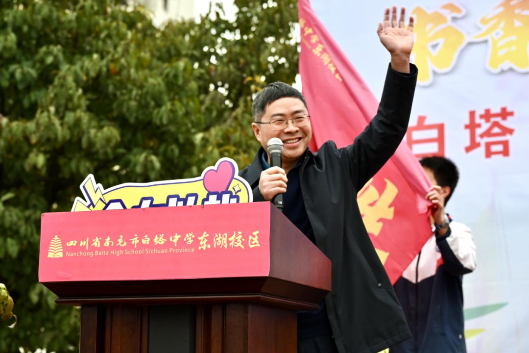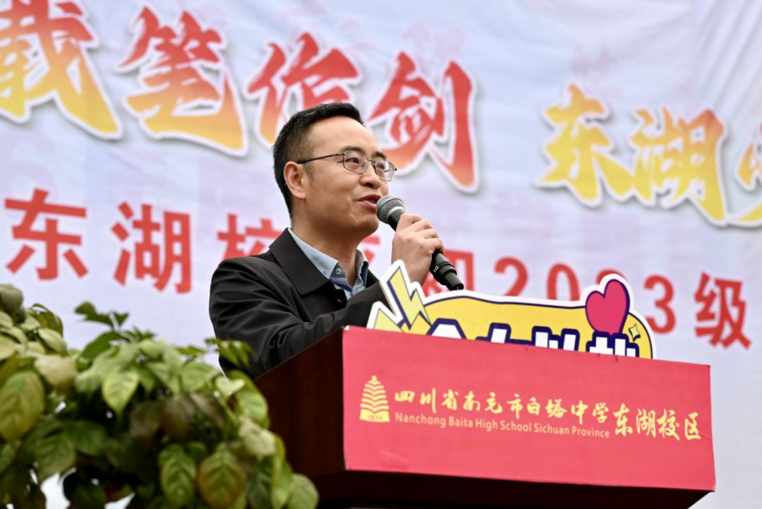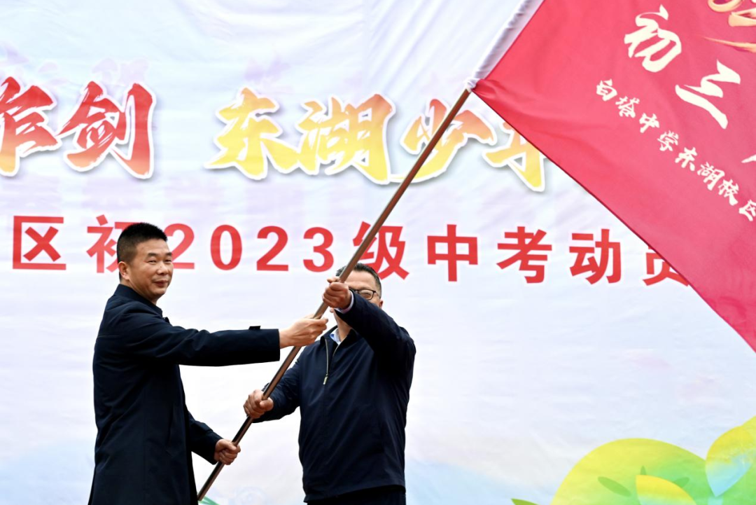 旌旗猎猎迎风展,战鼓声声催征程。在全场热烈的掌声与期待中,白塔中学党委副书记何松涛郑重地向东湖校区党支部书记、年级主任徐林授予年级战旗,并发布铿锵有力的青春逐梦动员令:“全力以赴,逐梦青春;奋勇争先,金榜题名!”