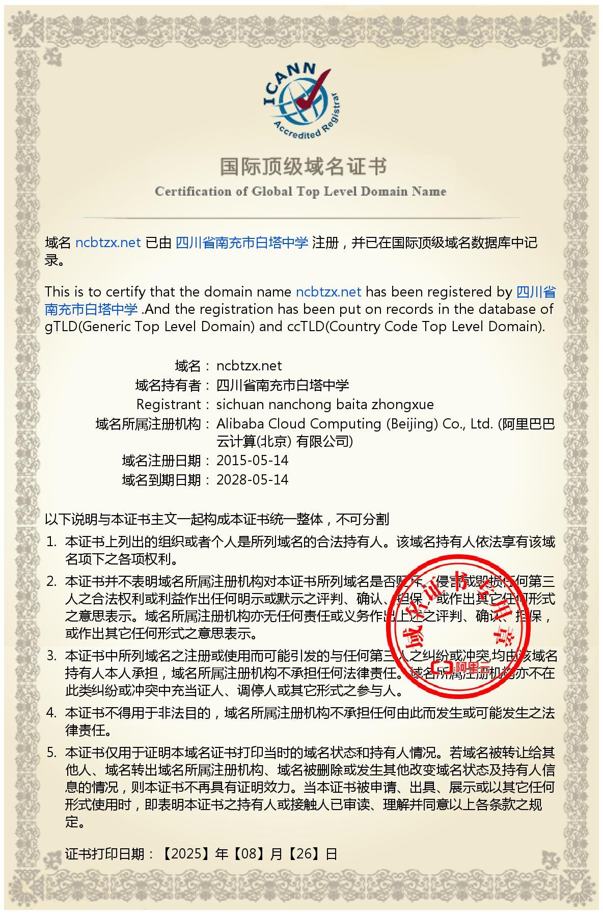 This is to certify that the domain name ncbtzx.net has been registered by 四川省南充市白塔中学.And the registration has been put on records in the database of gTLD(Generic Top Level Domain) and ccTLD(Country Code Top Level Domain).