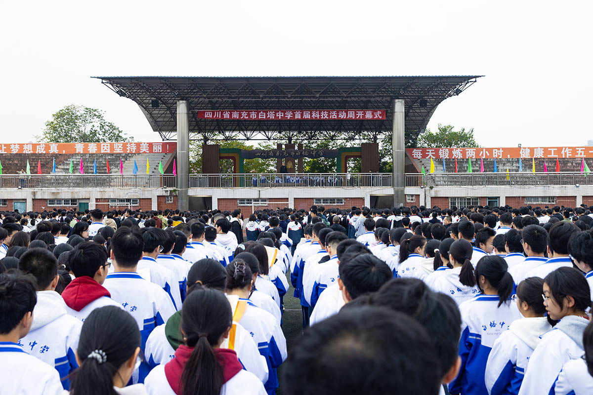 10月27日上午,南充市白塔中学全校师生相聚学校足球场,共同拉开了首届科技创新活动周的帷幕。