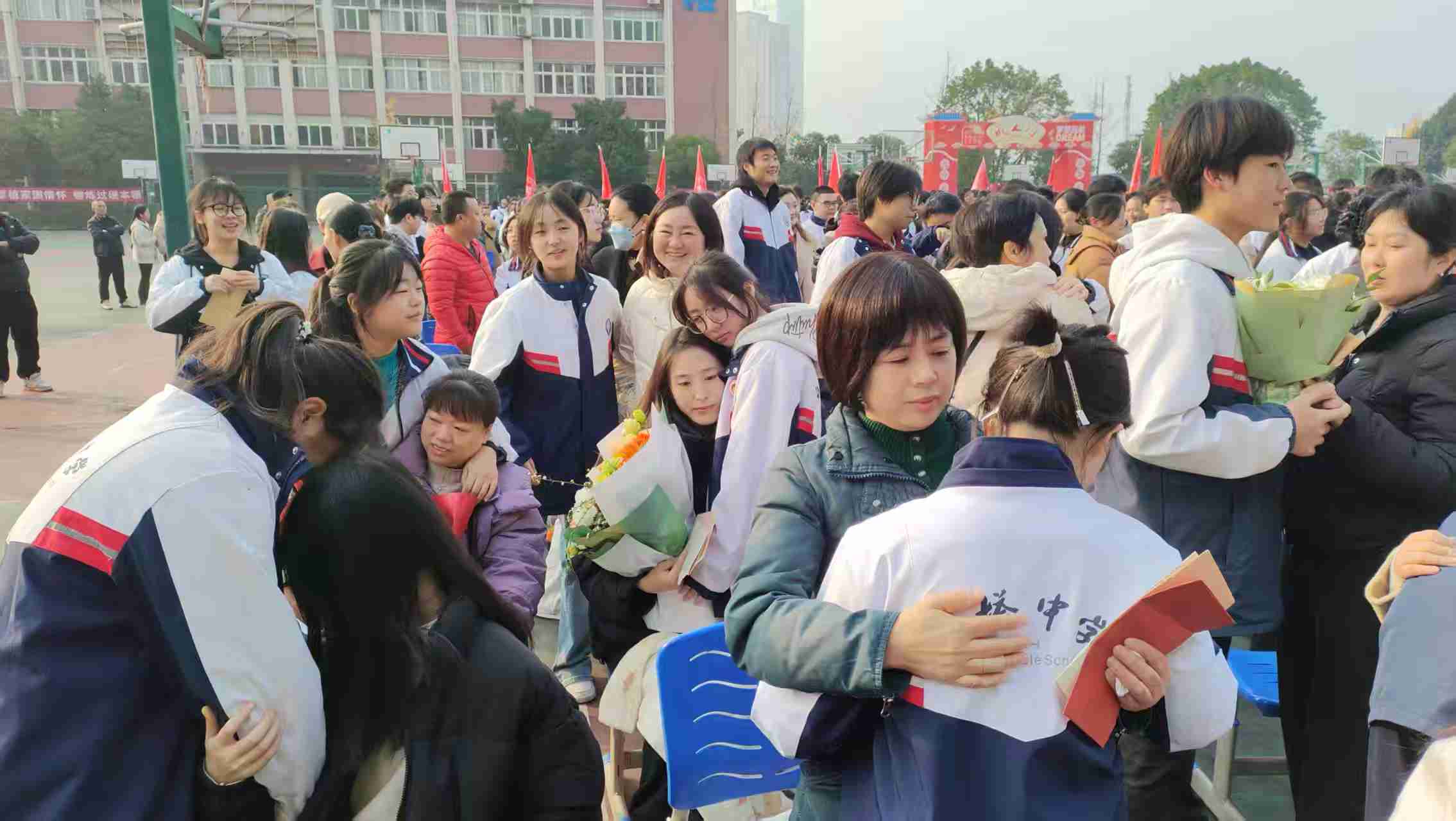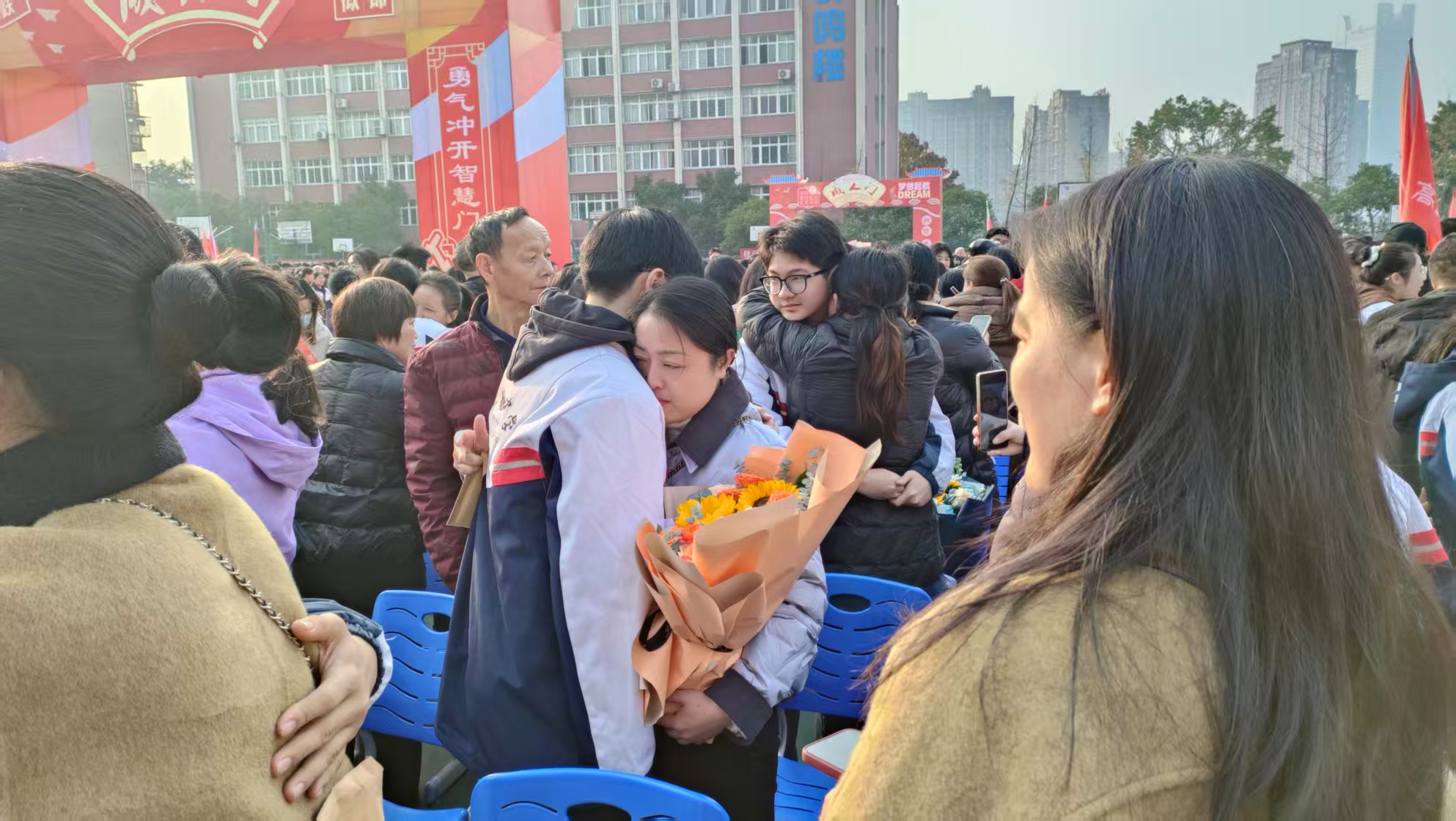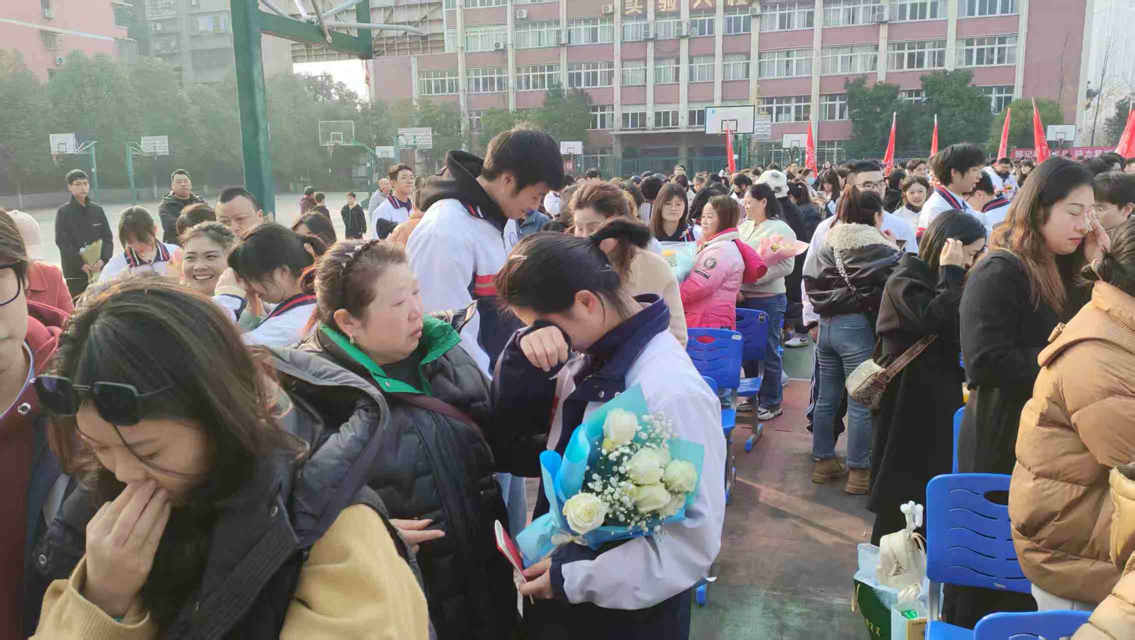 随后,全体高三学生面向家长深深三鞠躬,感谢父母的养育之恩;转身再向全体高三老师鞠躬致谢,感恩老师的谆谆教诲与辛勤培养。学生代表为老师们献上鲜花,表达对恩师真挚的敬意与祝福。