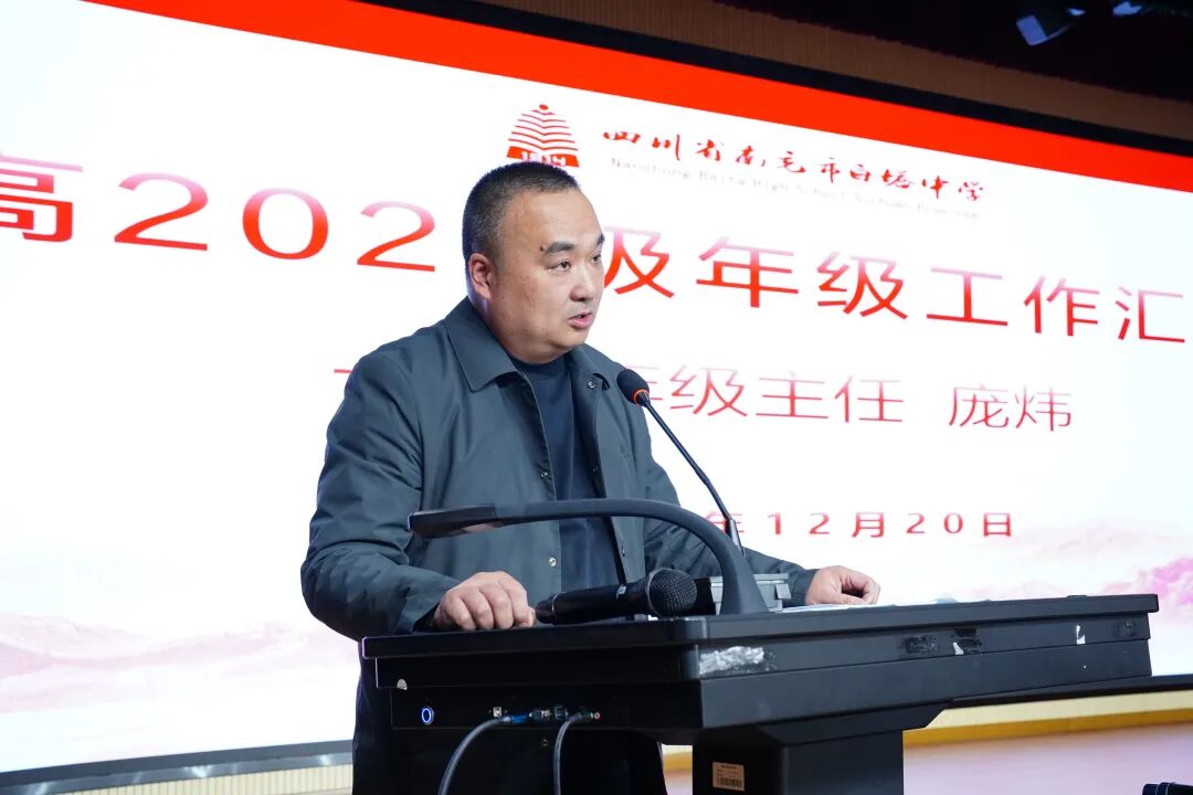 年级主任庞炜汇报了年级 “精细化教学、精准化育人” 的工作思路,包括通过多种方式提升教学质量、落实学生管理与身心健康培养、丰富校园活动等,并倡议家长关注孩子学习状态、重视心理健康,积极参与家校合作。