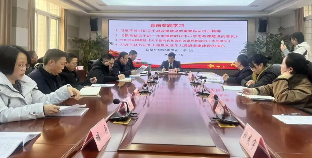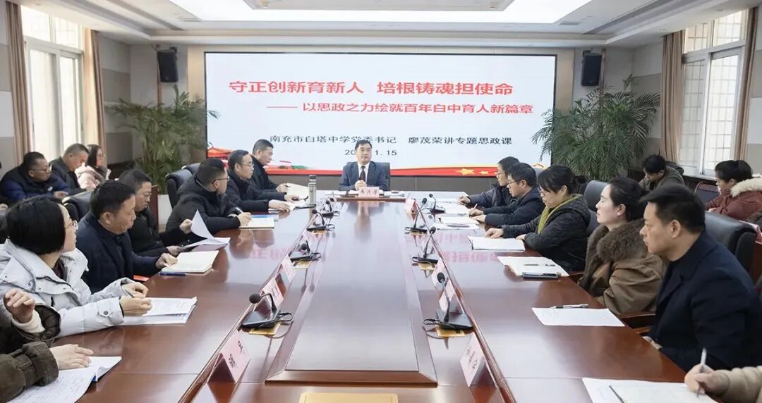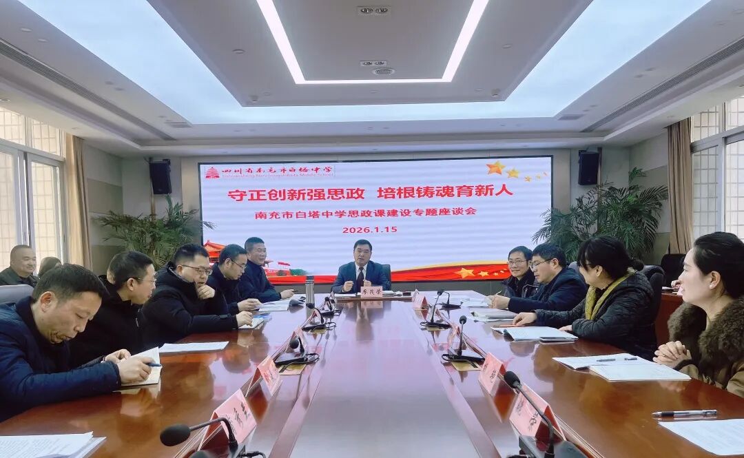 为深入贯彻落实习近平总书记关于思政课建设的重要指示批示精神,强化意识形态领域正面引领,更好发挥思政课立德树人重要功能,1月15日上午10点,南充市白塔中学在牛津楼二楼会议室召开全校思政课建设专题座谈会。本次会议以“守正创新强思政,培根铸魂育新人——以高质量思政教育筑牢立德树人根基”为主题,校级领导、党委办、政教处、教务处、教科室、团委、年级等相关部门中层干部、全校专职及兼职思政课教师、语文、历史等学科教师代表及班主任代表齐聚一堂,会议由学校党委副书记何松涛同志主持。